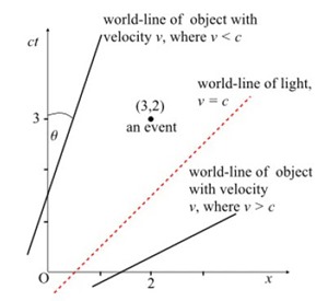 Events: something that happens instantaneously at a single point in spacetime, such as a light flashing, or a point on a moving object passing another point. All events in spacetime are defined using the four coordinates t, x, y, z. Imagine a particle moving through spacetime as a succession of events through spacetime, the line linking all those events is called the particle’s world-line.