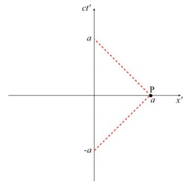 As a varies, so will the position of point P. In fact, because of the constancy of the speed of light, point P (where ct’ always equals zero) traces out the x’ axis for different values of a.