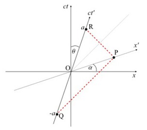 through O. Therefore, the x’ axis must make the same angle with the x axis as the ct’ axis makes with the ct axis, ie . θ = α
