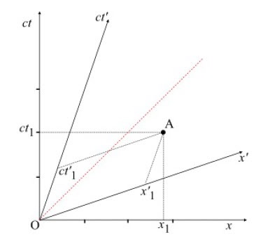axis gives us the ct’ coordinate – . Similarly, we then construct a line passing through A and parallel to the ct’ axis. Where this line crosses the x’ axis give us the x’ coordinate – .