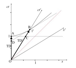 From the point of view of O, the clocks on frame S’ belonging to O’ are running slow. The black arrow TD is the time dilation observed by O. Observer O measures event D occurring at a time ct < 1 on his ct axis. However, observer O’ measures the same event occurring at time ct = 1