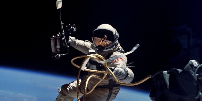 Hace 50 años, el 3 de Junio de 1965, Edward White salió de la nave orbitando, Gemini 4, para ser el primer estadounidense en caminar en el espacio. White es fotografiado en esta toma por el comandante de la misión, James McDivit desde adentro de la cápsula mientras White flotaba …