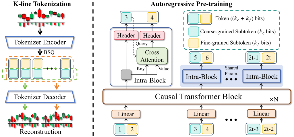 - Tokens coarse-to-fine: Cada token se divide en un subtoken grueso (coarse) y uno fino (fine), optimizados por una función de pérdida jerárquica. El primero codifica el estado general del mercado, el segundo agrega detalle.