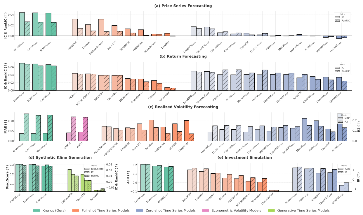 Kronos supera a todos los TSFM generalistas y baselines clásicos (iTransformer, PatchTST, DLinear, GARCH) en todas las tareas clave: